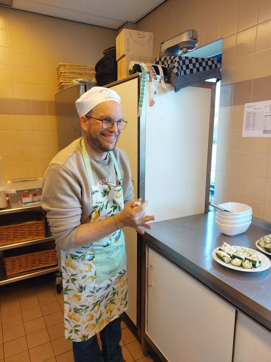 Vandaag vond de finale plaats van de kookwedstrijd ‘Ben jij onze Sjefkok?’. Vijf enthousiaste koks – Bert, Linda, Sander, Elviëno en Stefano – lieten hun kookkunsten zien door een gezonde snack te bereiden en te presenteren aan de jury, bestaande uit Mike (cliënt Spotlight), Christel Welling (expertisemanager) en Annemarieke (diëtist).