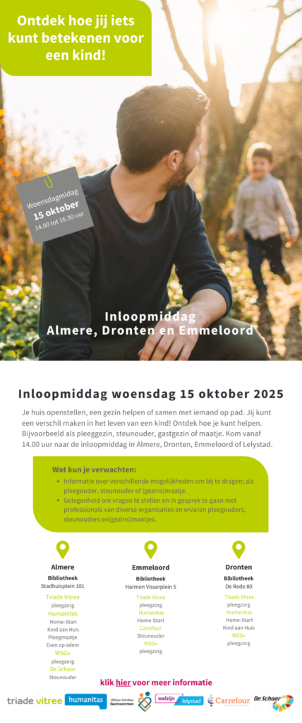 Deze middagen zijn interessant voor mensen die interesse hebben in pleegouder worden, maar ook voor mogelijke steunouders of pleegmaatjes. Je hoeft je hiervoor niet apart aan te melden, maar kunt vanaf 14:00u. binnenlopen als je vragen hebt of informatie wil.