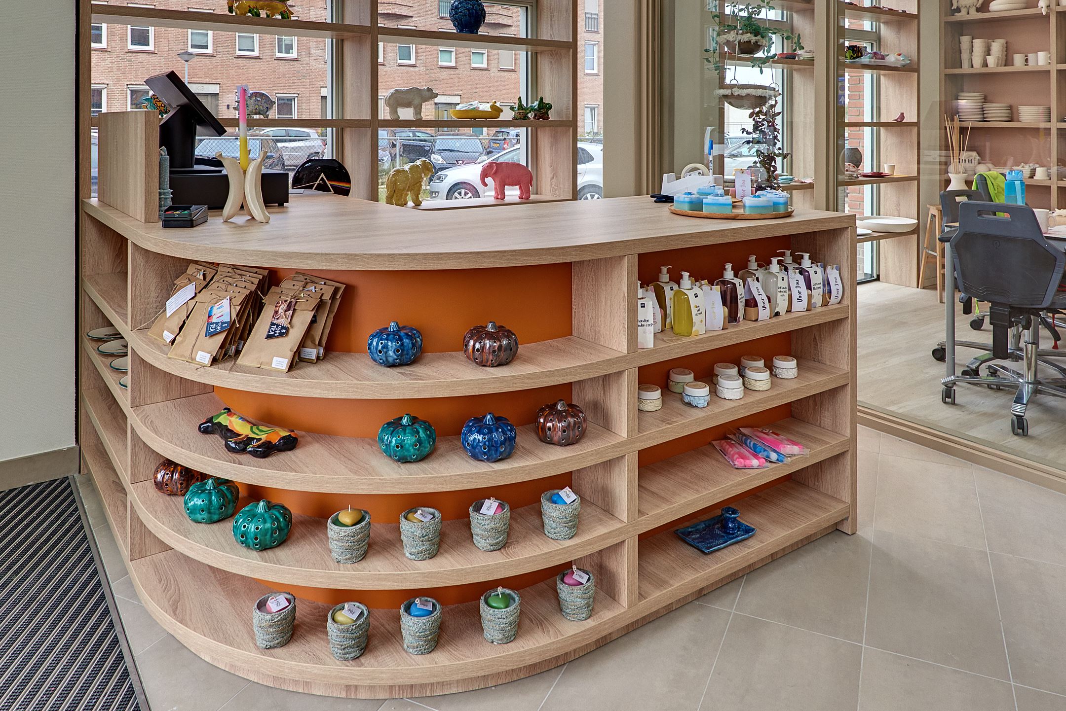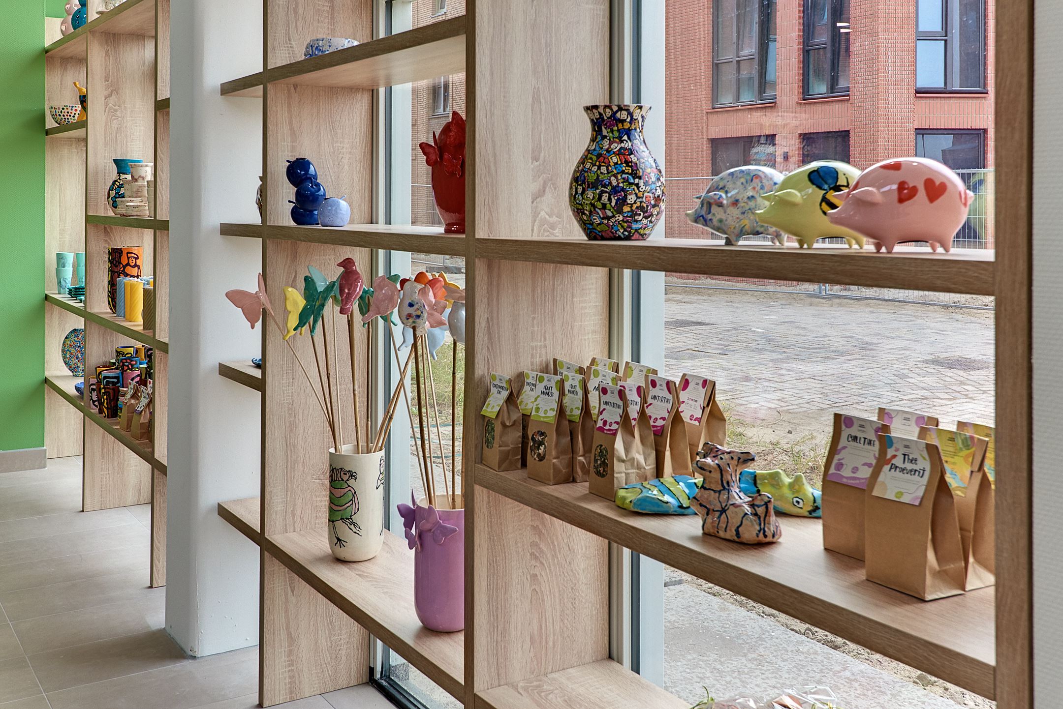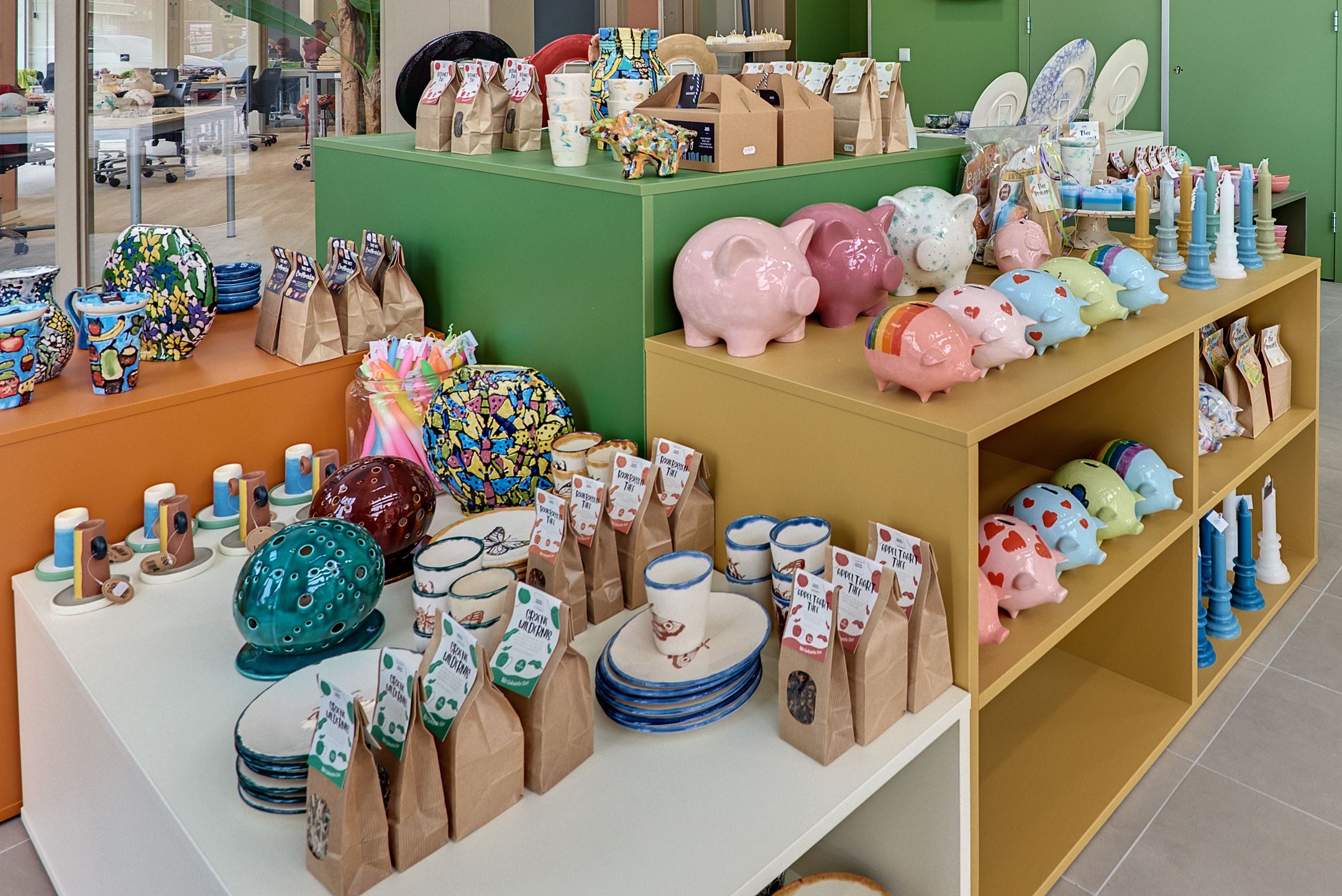 Vanuit de winkel kun je de werkplaats van Triambacht zien. Daar worden de keramieken producten gemaakt. Zo zie je meteen waar een deel van de spullen uit de winkel vandaan komt.